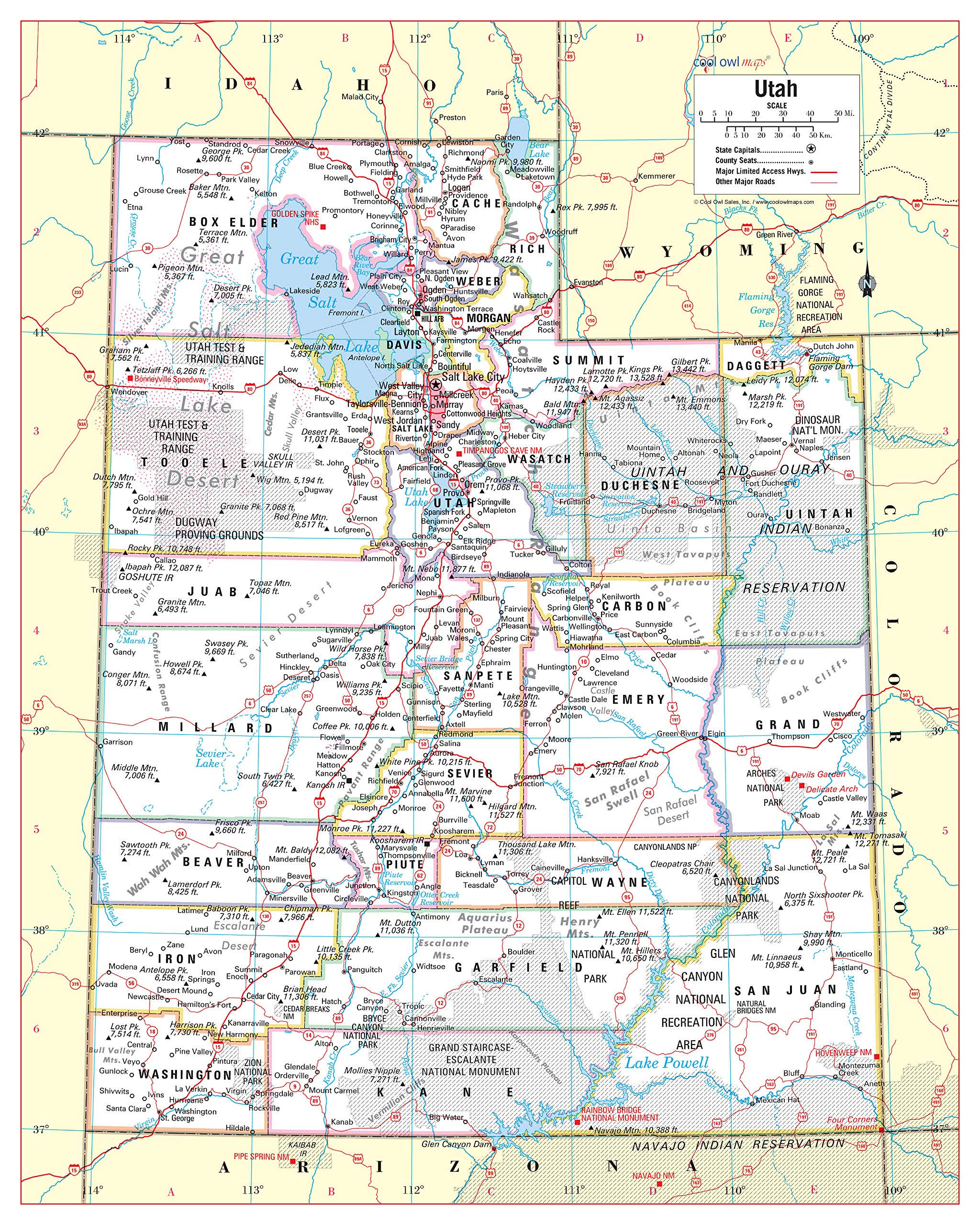 Cool Owl Maps Utah State Wall Map Poster Rolled 24"Wx30"H (Laminated)
