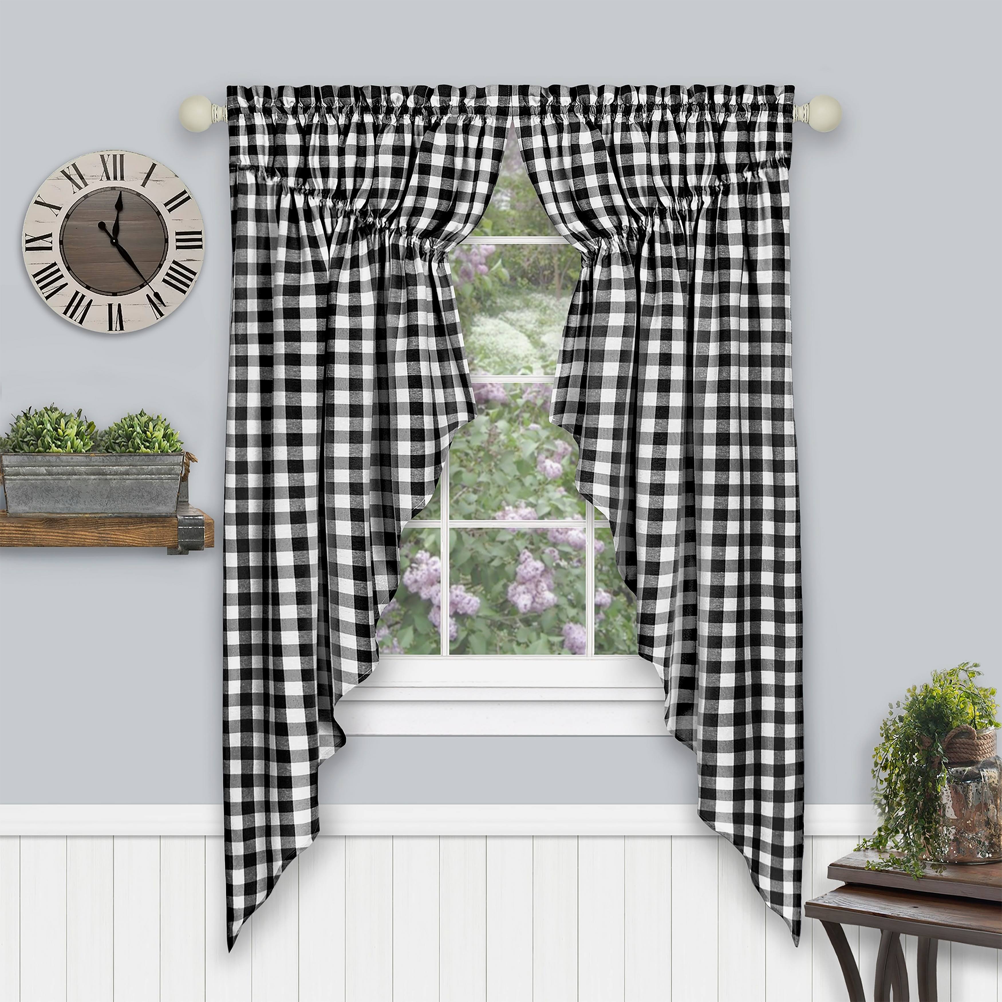 Buffalo Check Gathered Swag Window Curtain Pair, 72x63 Inches - Black