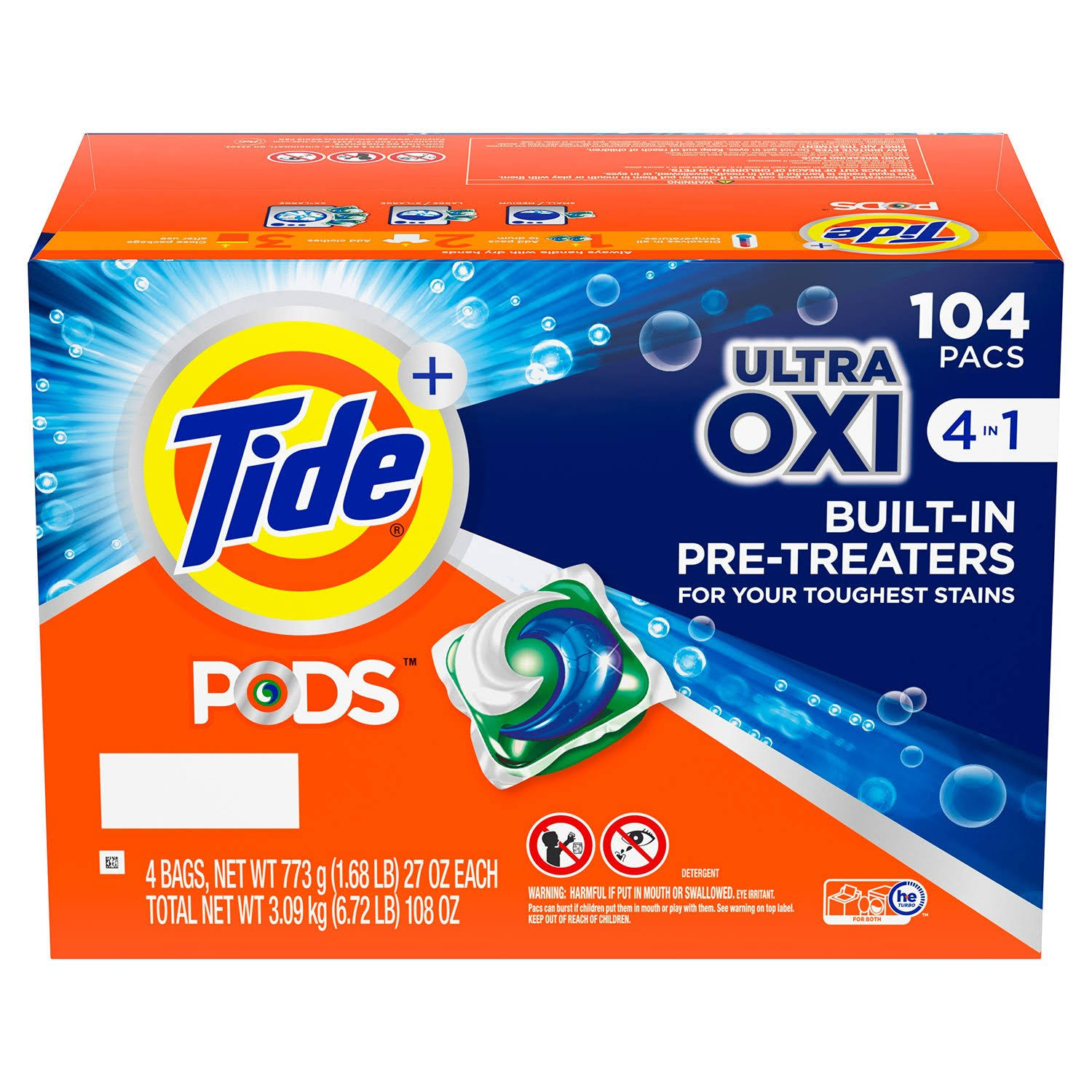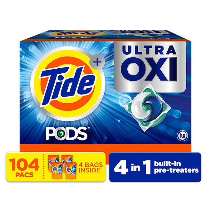 Tide Pods Liquid Detergent Pacs, 4-in-1 Ultra Oxi, 104 Ct.