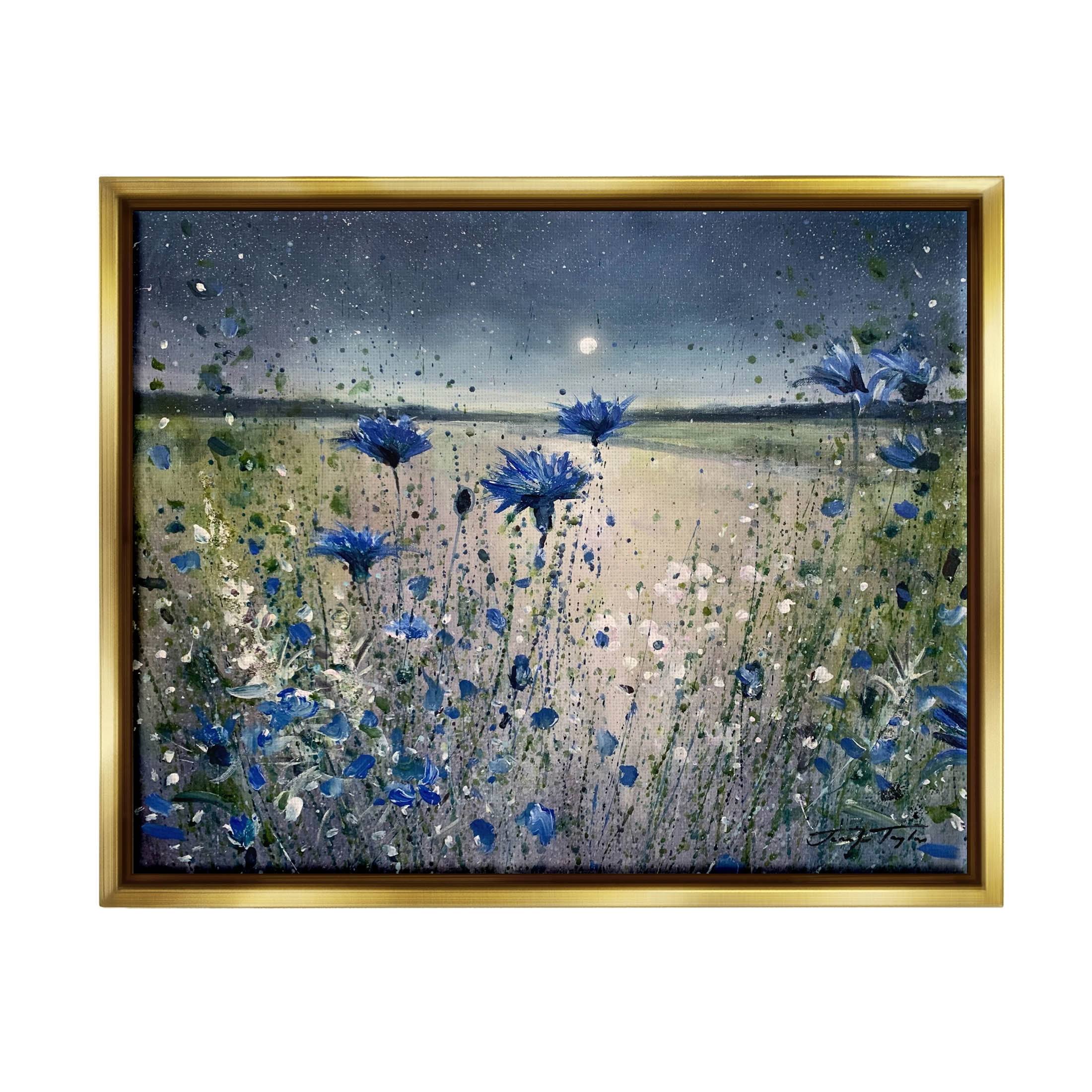 Stupell Blooming Blue Flowers Night Moon Floater Canvas Wall Art by Jennifer Taylor Art - 21 x 17 - Gold