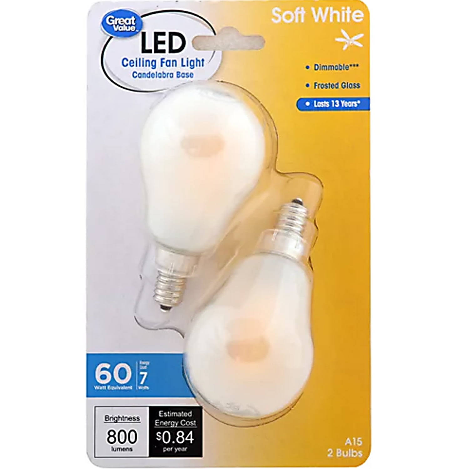 Great Value LED Ceiling Fan Bulb, 7-Watt (60W Equivalent) A15 with E12 Base Soft White, 2 Pack