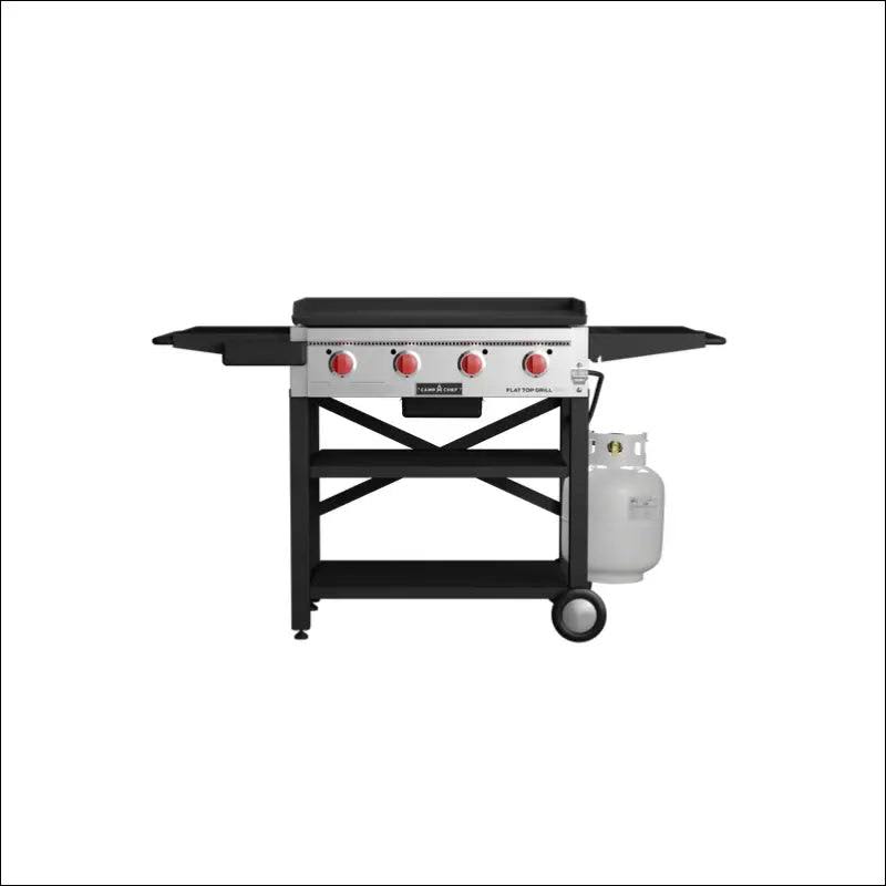 Camp Chef Propane Gas Grill 4-Burner Flat Top Folding Side Shelves Black