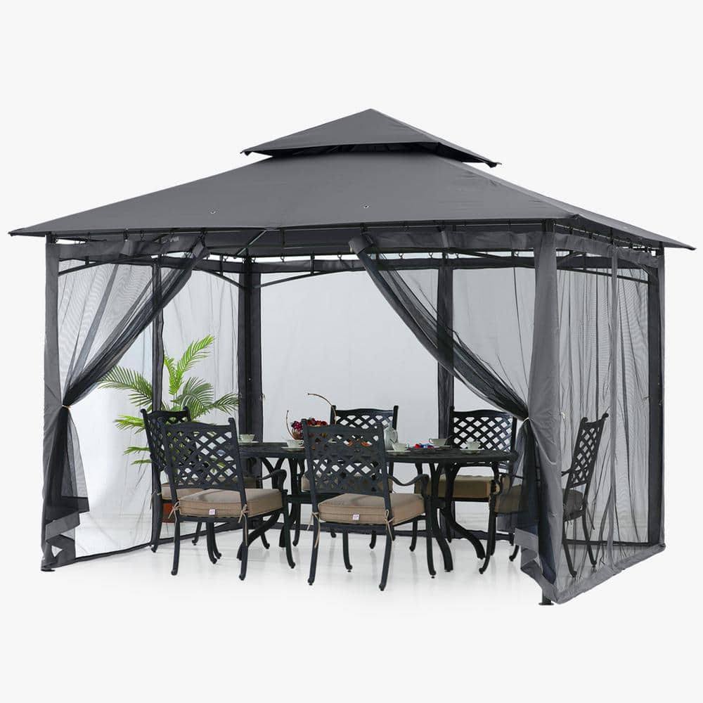 10 ft. x 12 ft. Gray Steel Outdoor Patio Gazebo with Vented Soft Roof Canopy and Netting