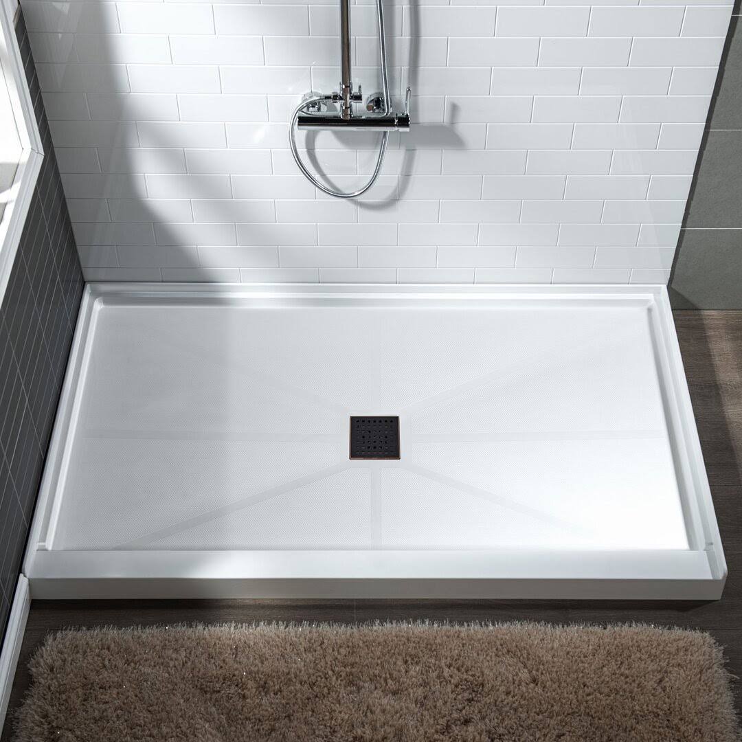 Woodbridge Krasik 48 in. L x 36 in. W Alcove Solid Surface Shower Pan Base with Center Drain in White with Oil Rubbed Bronze Cover, White with Oil